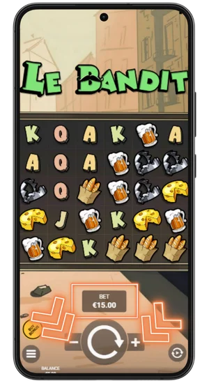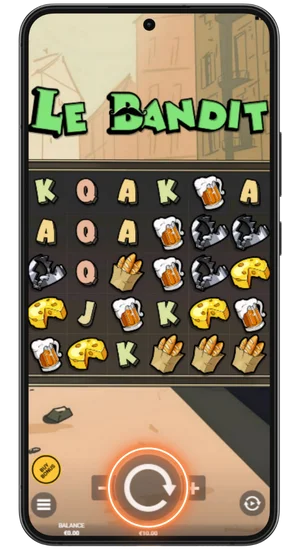 Le Bandit runs directly in your mobile browser using HTML5 — no app, no downloads, no installations. During mobile play, the layout, cascades, Coin features, and Golden Squares behave the same way as on desktop, just adapted to a smaller screen.